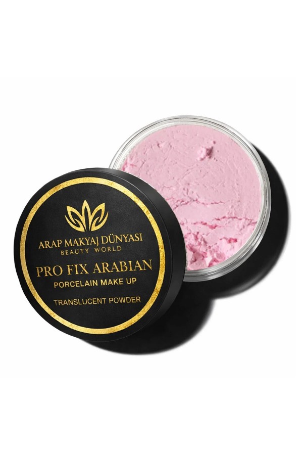 PRO FIX ARABIAN Porcelain Make Up Transparan Pudra - Pembe, makyajı sabitlemeye yardımcı olan hafif yapılı transparan pudradır. Ciltte ağırlık hissi oluşturmadan daha pürüzsüz, daha mat ve daha dengeli bir görünüm sunmaya destek olur. İnce yapısı sayesinde fondöten ve kapatıcı üzerine kolayca uygulanır. Gün içinde oluşan fazla parlama görünümünü azaltmaya yardımcı olur ve ten makyajının daha düzenli görünmesine katkı sağlar.